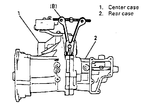 NOTE: Watch out for interlock steel ball which comes out from between 2 shift shafts so as not to lose it. If it doesn't come out, remove rubber plug and take it out.
