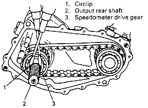 6. Remove circlip by using screwdrivers and hammer, then pull out speedometer drive gear.