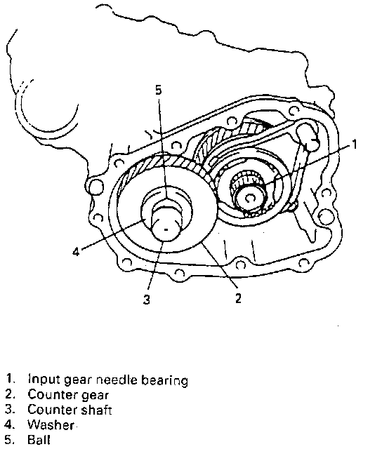 12. Remove input gear needle bearing. Remove counter gear shaft together with needle bearings, spacer, washers and steel balls from case.
