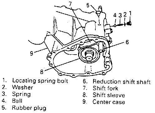 14. Remove locating spring bolt with washer, spring and ball for reduction shift. Remove rubber plug as well.