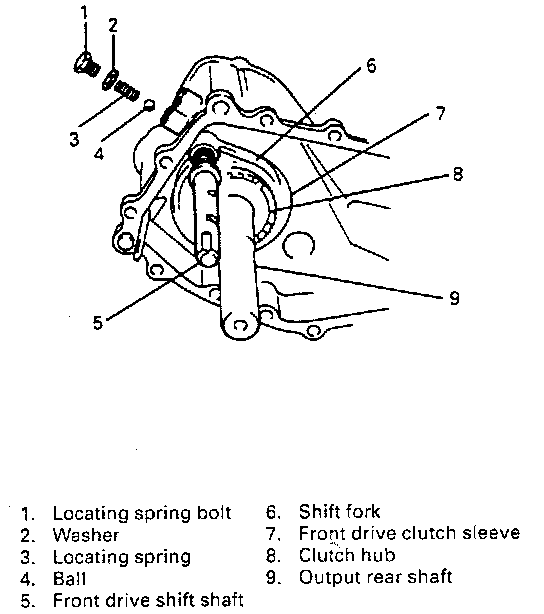 16. Remove locating spring bolt with washer, spring and ball for front drive shift.
