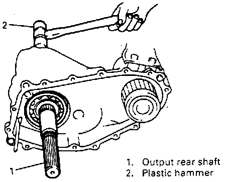18. Using plastic hammer, drive out output rear shaft assembly with bearing. Output low gear and reduction clutch hub also come off as they are installed to shaft.
