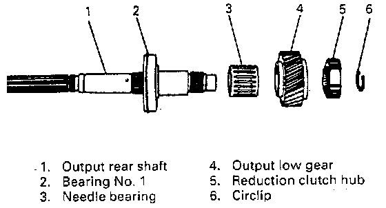 19. Pull off circlip from shaft and remove reduction clutch hub, output low gear and needle bearing.