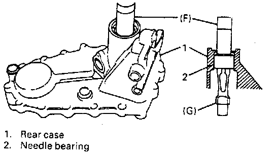 25. Remove oil seal from rear case. And then, using same special tools and press as in above step, remove needle bearing from rear case.