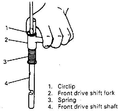 30. With spring on front drive fork shaft compressed, remove circlip and then remove fork and spring.