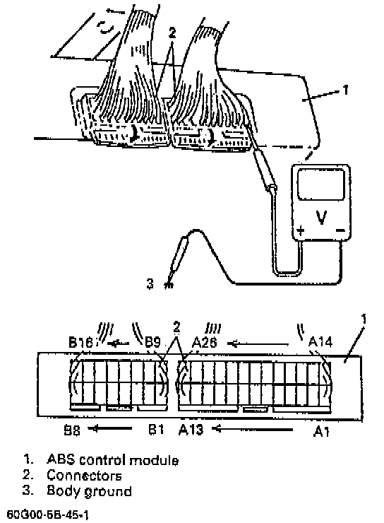 CAUTION: Never connect voltmeter or ohmmeter to Antilock Brake System (ABS) control module with connector disconnected from it. Attempt to do it may cause damage to ABS control module.