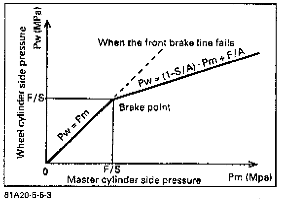 The proportioning valve regulates the brake fluid pressure in the rear brake line, which is the same both on the master cylinder side and wheel cylinder side up to the break-point in the graph (F/S) but once the fluid pressure on the master cylinder side exceeds that point, that on the wheel cylinder side increases as shown by the graph.