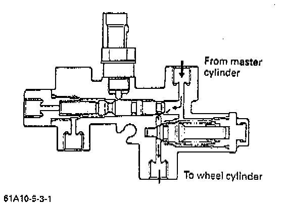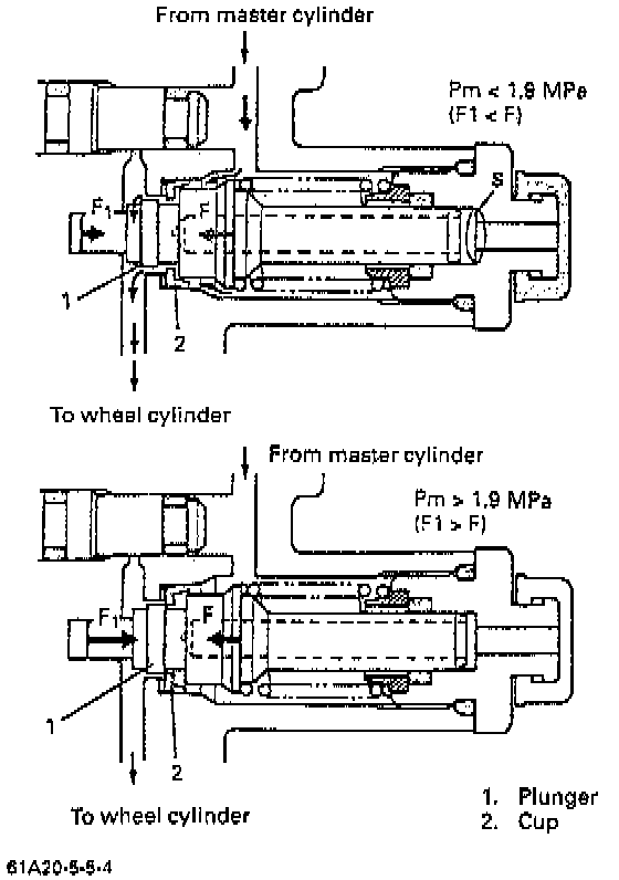 Till the master cylinder side pressure (Pm) reaches (F/S), the spring force (F) is higher than the force caused pressure (F = Pm*S) and so Pm is transmitted to the wheel cylinder side as it is through the opening between the plunger and cup. As Pm rises higher than (F/S), F. exceeds F and the plunger moves to the right as shown in the figure to close the above opening.