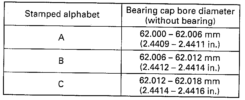 For example, stamped alphabet "A" indicates that corresponding bearing cap bore diameter is 62.000 - 62.006 mm.