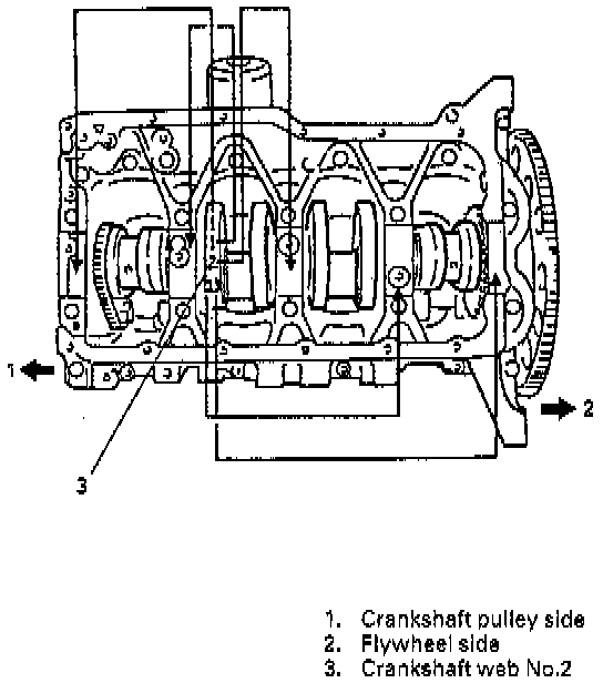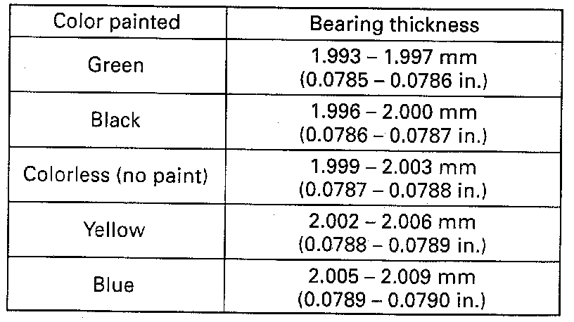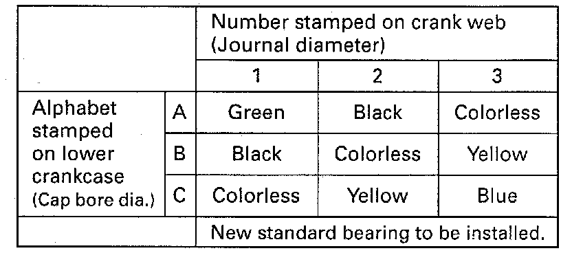 For example, if number stamped on crank web No.2 is "1 " and alphabet stamped on lower crankcase is "B", install a new standard bearing painted in "Black" to its journal.