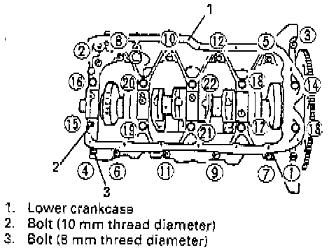6. Install lower crankcase to cylinder block. Apply oil to crankcase bolts before installing them. Tighten crankcase bolts, following sequence in figure. Tighten crankcase bolts to specified torque.