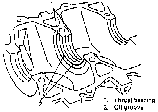 3. Fit thrust bearings to cylinder block between No.2 and No.3 cylinders. Face oil groove sides to crank webs.