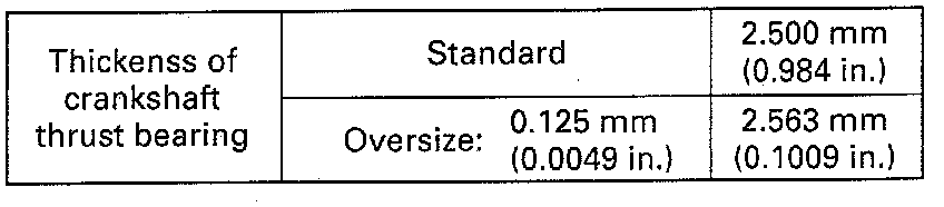 Crankshaft journal diameter (0.25 mm undersize): 57.698 - 57.744 mm (2.2716 - 2.2733 inch)