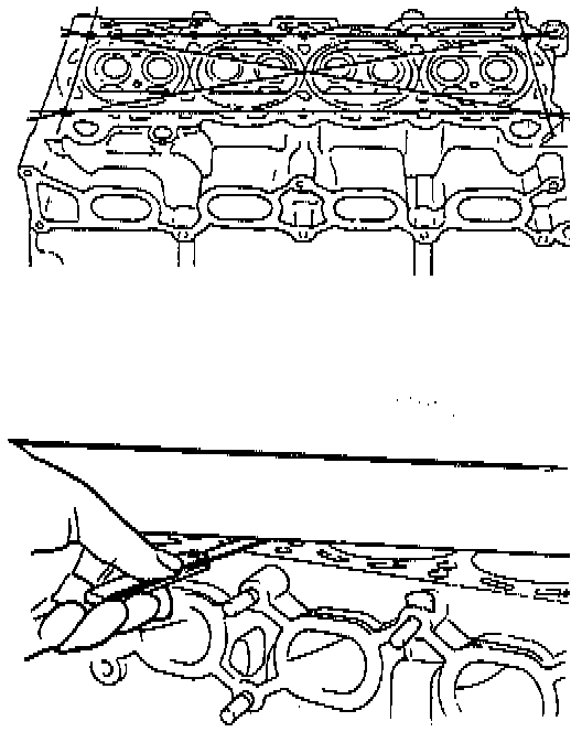 - Check cylinder head for cracks in intake and exhaust ports, combustion chambers, and head surface at a total of 6 locations. If distortion limit, given above, is exceeded, correct gasketed surface with a surface plate and abrasive paper of about #400 (Waterproof silicon carbide abrasive paper): Place paper on and over surface plate, and rub gasketed surface against paper to grind off high spots. Should this fail to reduce thickness gauge readings to within limit, replace cylinder head.