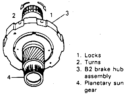 15. With B2 brake hub assembly held stationary, turn planetary sun gear clockwise to check that it locks and then counterclockwise to check that it turns smoothly.
