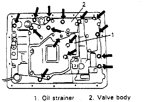 18. Remove valve body mounting bolts as shown.