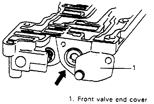 3. Remove one cover bolt on front valve end cover and loosen the other to move cover as shown in figure. Remove secondary regulator valve sub assembly and secondary regulator valve spring. Then remove remaining loose cover bolt to remove front valve end cover.