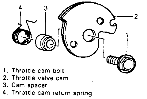 4. Remove throttle cam bolt and then remove throttle valve cam, throttle cam return spring and cam spacer.