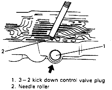 2. With 3-2 kickdown control valve plug pressed with finger, take out needle roller with magnet. Then remove 3-2 kickdown control valve plug, clutch sequence valve and reverse brake sequence valve spring.