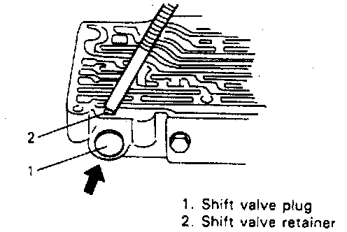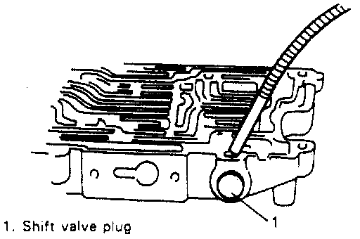3. With shift valve plug pressed with finger, take out shift valve retainer with magnet and then remove shift valve plug and 3-4 shift valve spring.