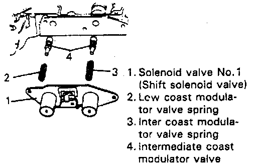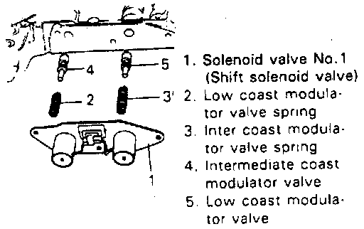 6. After removing shift solenoid valve (A & B), remove solenoid valve gasket, low coast modulator valve spring, intercoast modulator valve spring and 2 intermediate coast modulator valves.