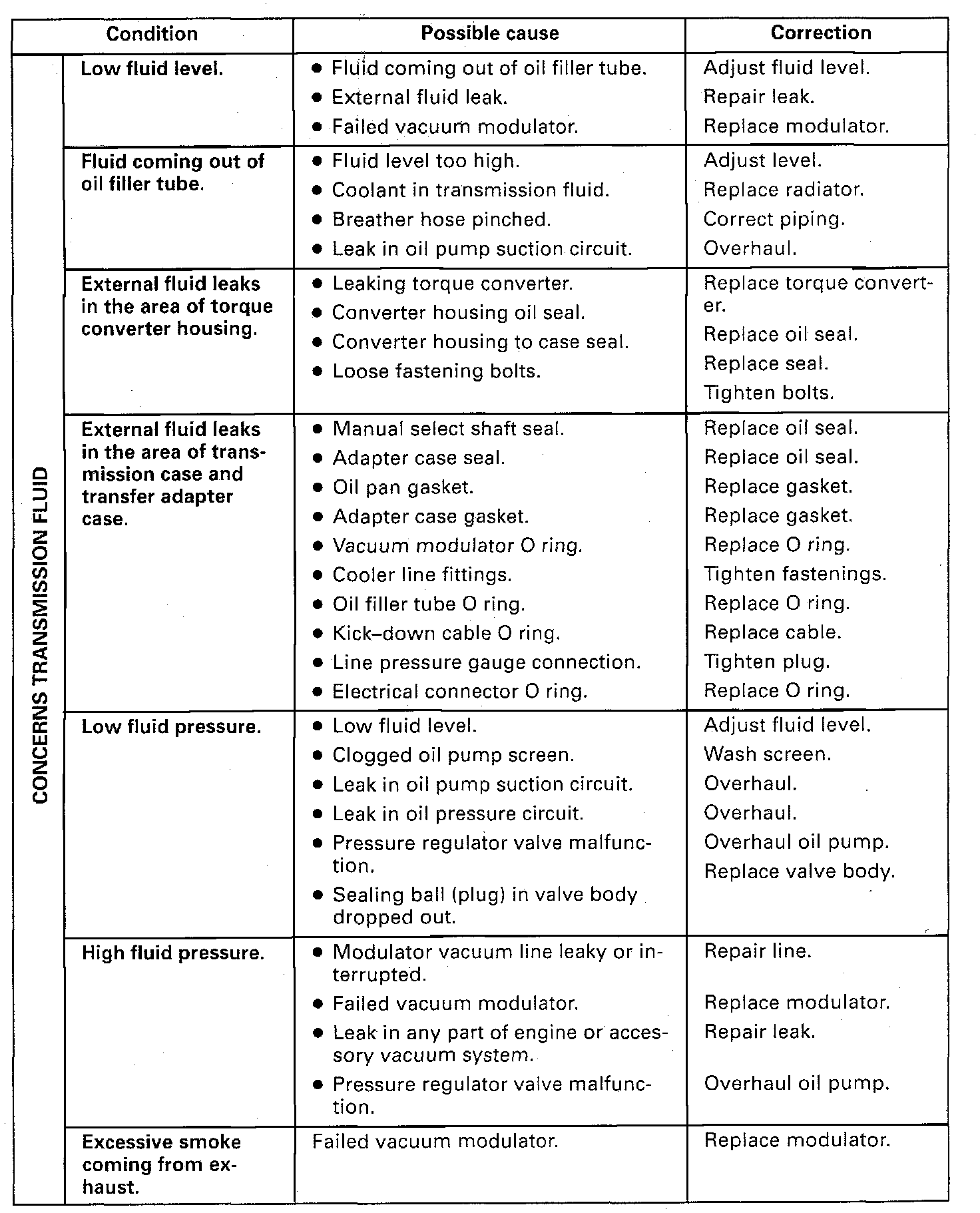 Before diagnosis of any transmission complaint is attempted, there must be understanding of fluid checking procedure and what appearance the fluid should have. Many times a transmission malfunction can be traced to low fluid level or improper reading of oil level gauge. Due to the transmission fluid that is now being used it may appear to be darker and have a stronger odor.