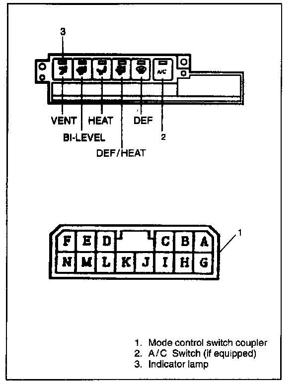 - With battery voltage (+) connected to terminal "K" and (-) to terminal "D", press A/C button and check if indicator lamp lights.