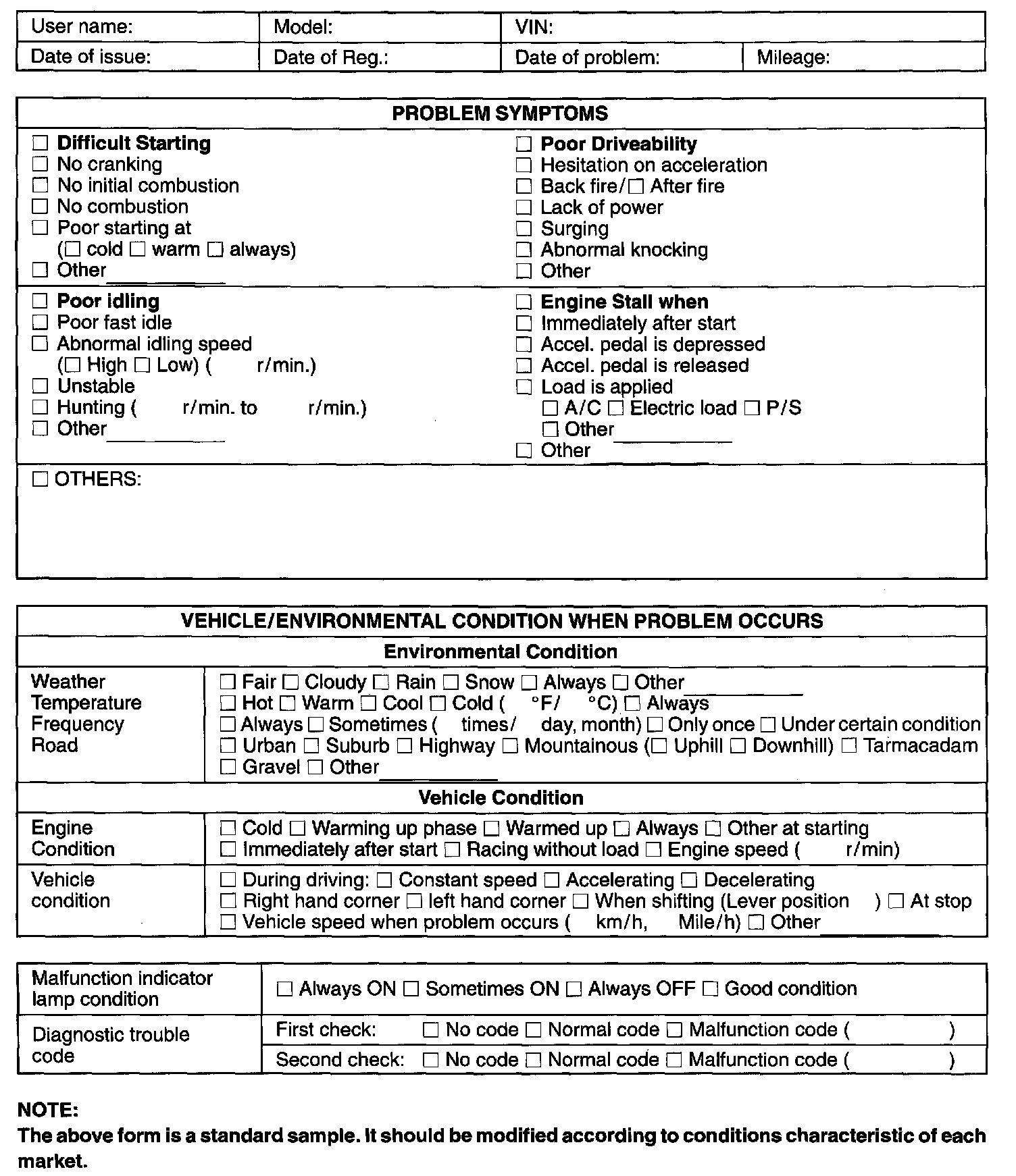 Record details of the problem (failure, complaint) and how it occurred as described by the customer. For this purpose, use of such an inspection form will facilitate collecting information to the point required for proper analysis and diagnosis.