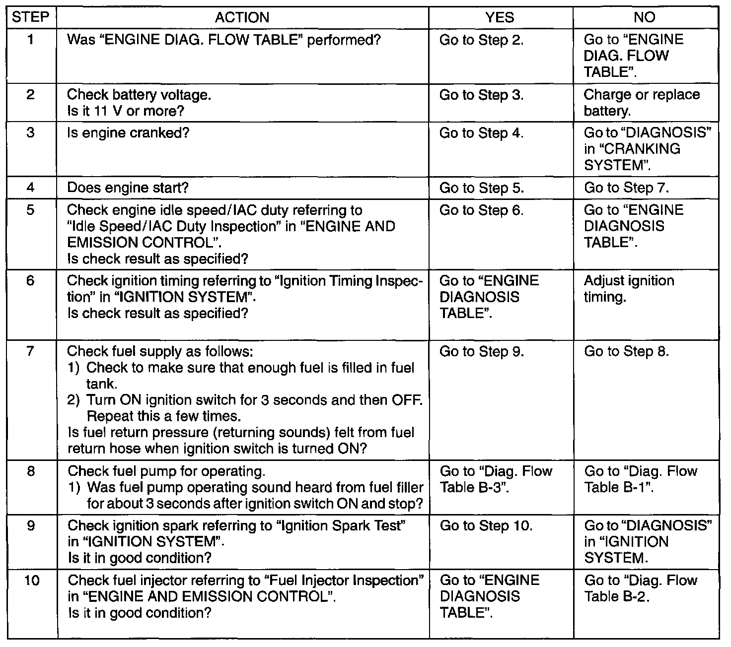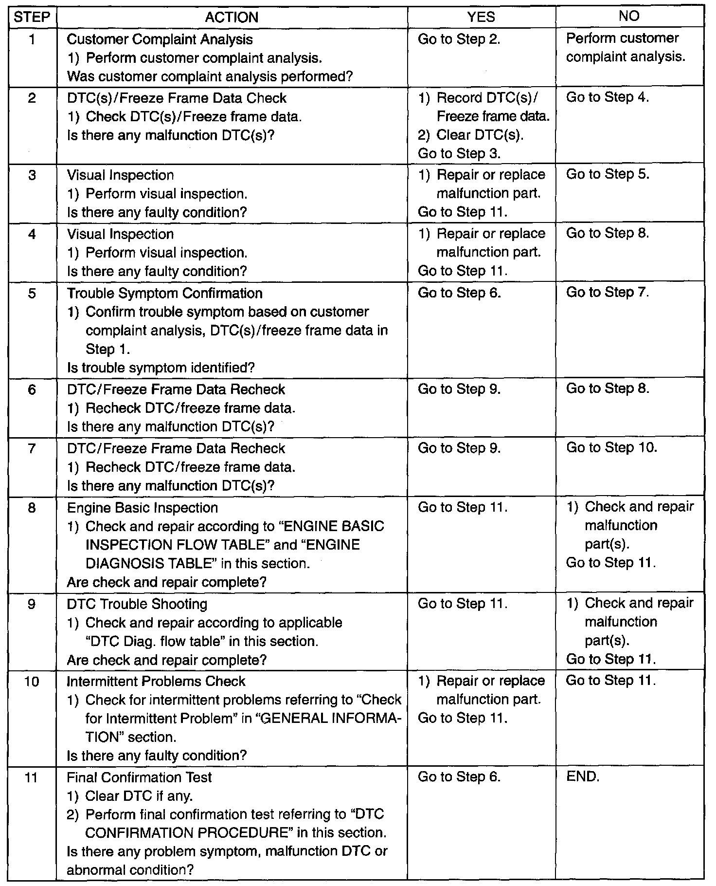 Perform basic engine check according to the "Engine Basic Inspection Flow Table" first. When the end of the flow table has been reached, check the parts of the system suspected as a possible cause referring to ENGINE DIAGNOSIS TABLE and based on symptoms appearing on the vehicle (symptoms obtained through steps of customer complaint analysis, trouble symptom confirmation and/or basic engine check) and repair or replace faulty parts, if any.