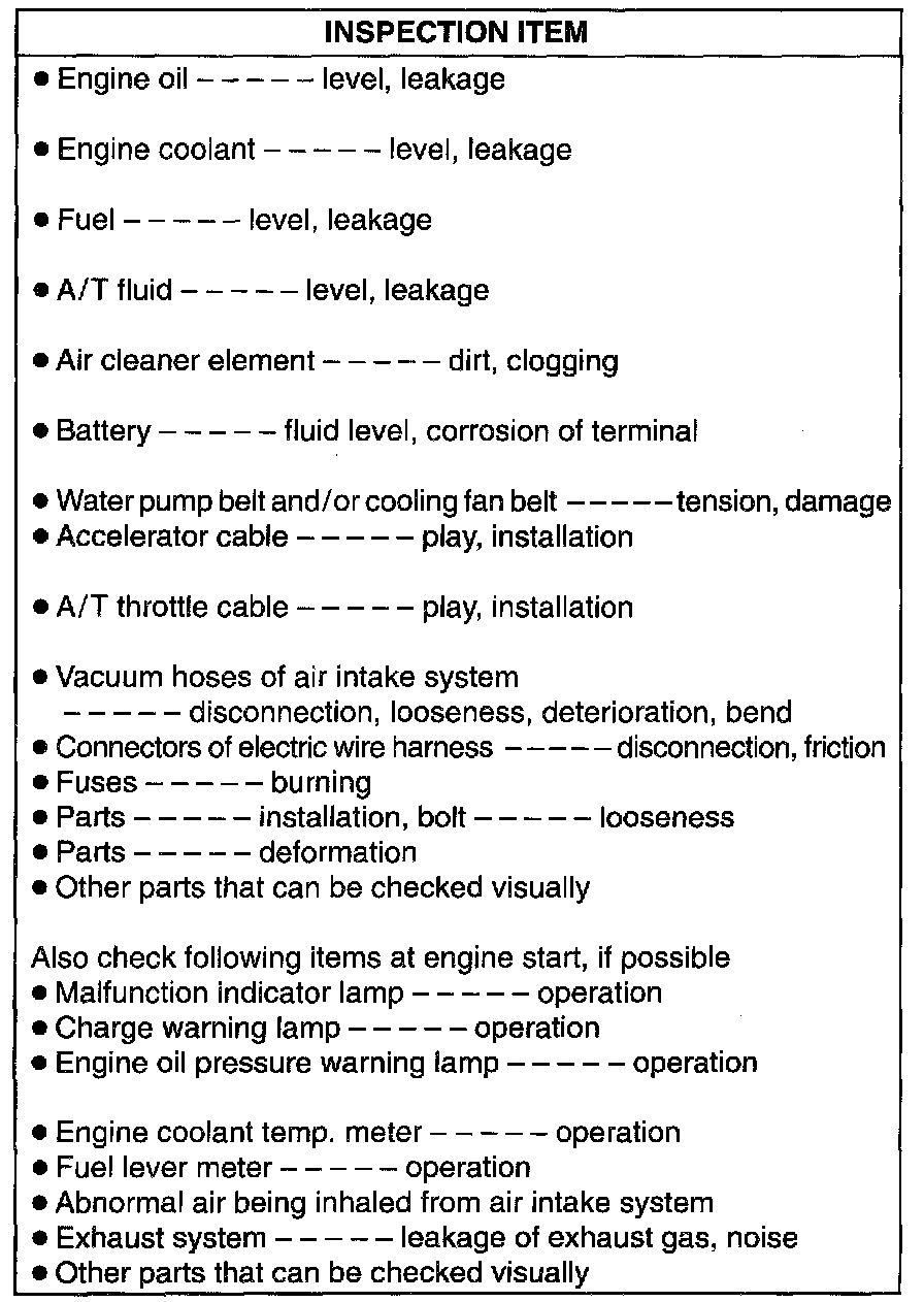 Be sure to perform visual check of the following items that support proper function of the engine.