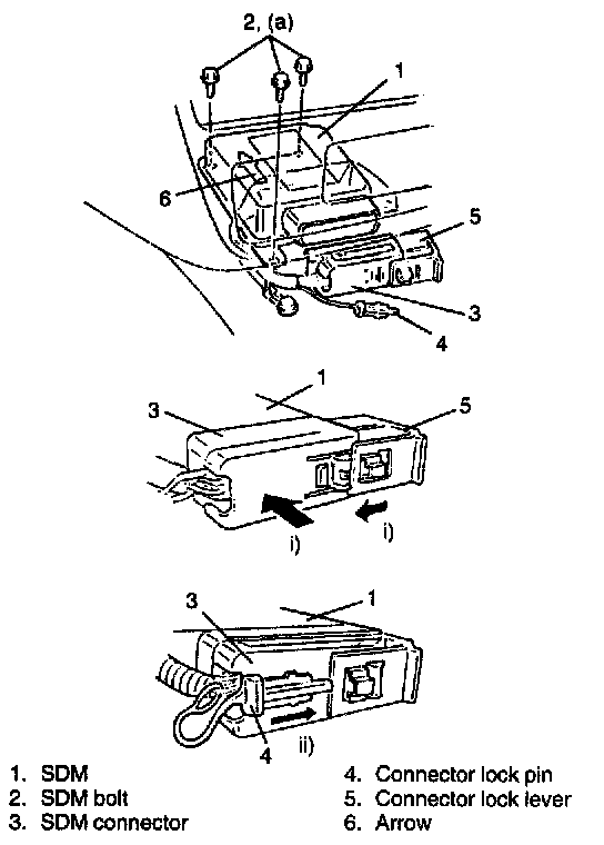 WARNING: During service procedures, be very careful when handling a Sensing and Diagnostic Module (SDM). Be sure to read "Service Precautions" before starting to work and observe every precaution during work. Neglecting them may result in personal injury or inactivation of the air bag system when necessary.REMOVAL
