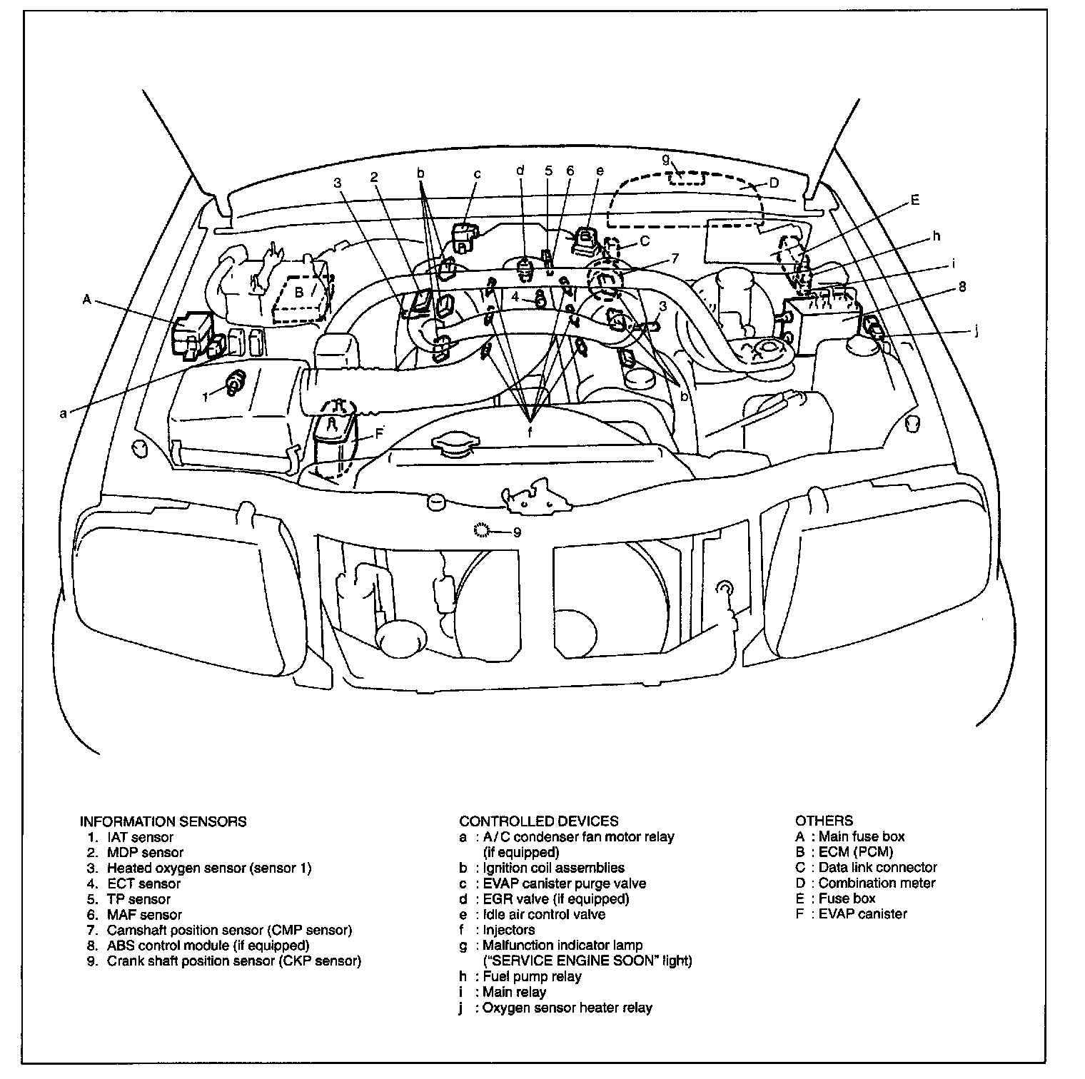 The electronic control system consists of 1) Various sensors which detect the state of engine and driving conditions, 2) ECM (PCM) which controls various devices according to the signals from the sensors and 3) Various controlled devices.