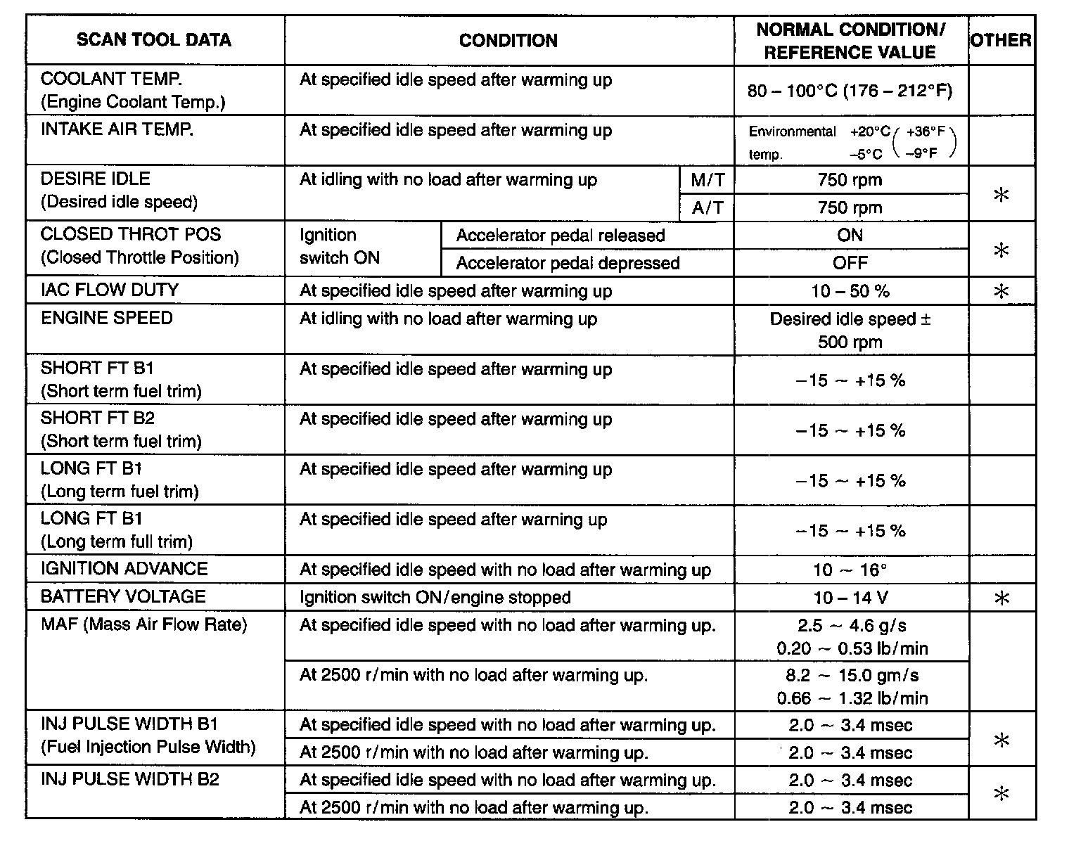 Also, conditions in the table that can be checked by the scan tool are those output from ECM (PCM) as Commands and there may be cases where the engine or actuator is not operating (in the condition) as indicated by the scan tool. Be sure to use the timing light to check the ignition timing.
