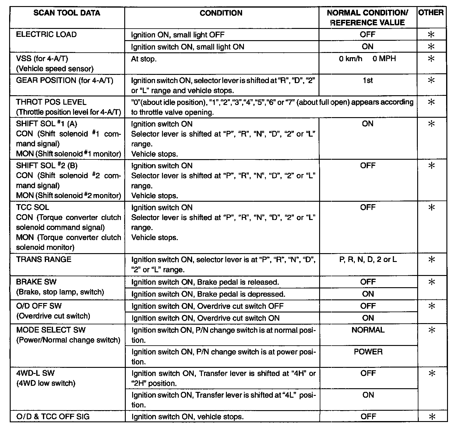 THROT POS LEVEL (THROTTLE POSITION LEVEL FOR 4-A/T , "0" ,"1" ,"2" ,"3" ,"4" ,"5" ,"6" or "7")