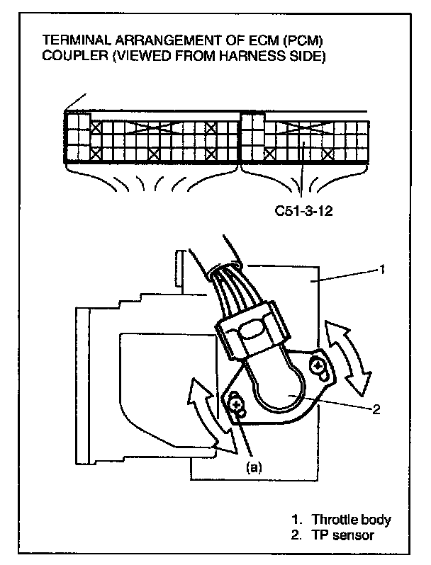 5. Turn TP sensor clockwise or counterclockwise and tighten TP sensor screw at a position where voltage as specified is obtained at coupler terminal C51-3-12.