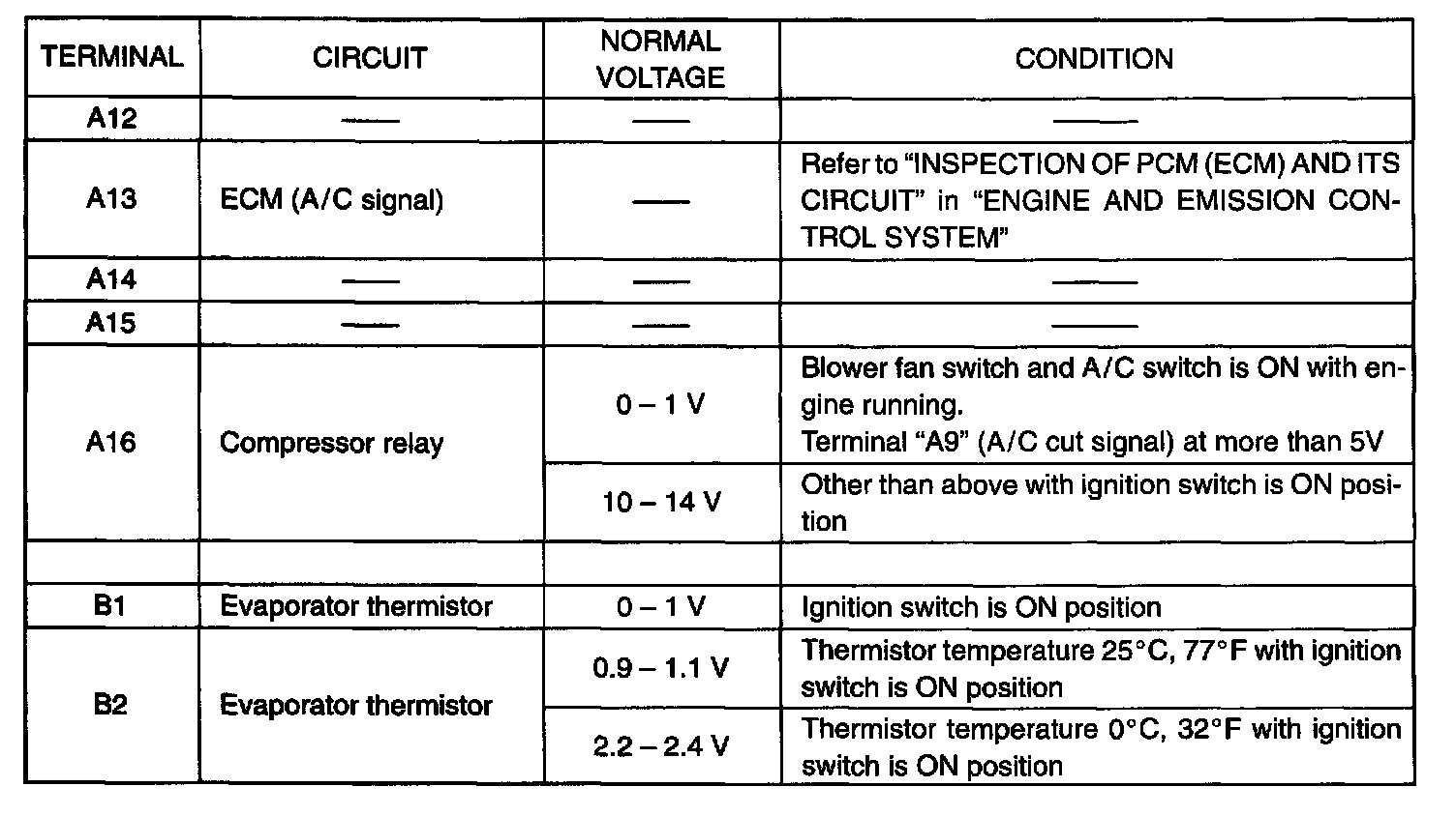 A/C Controller and its circuits can be checked at A/C controller wiring couplers by measuring voltage.
