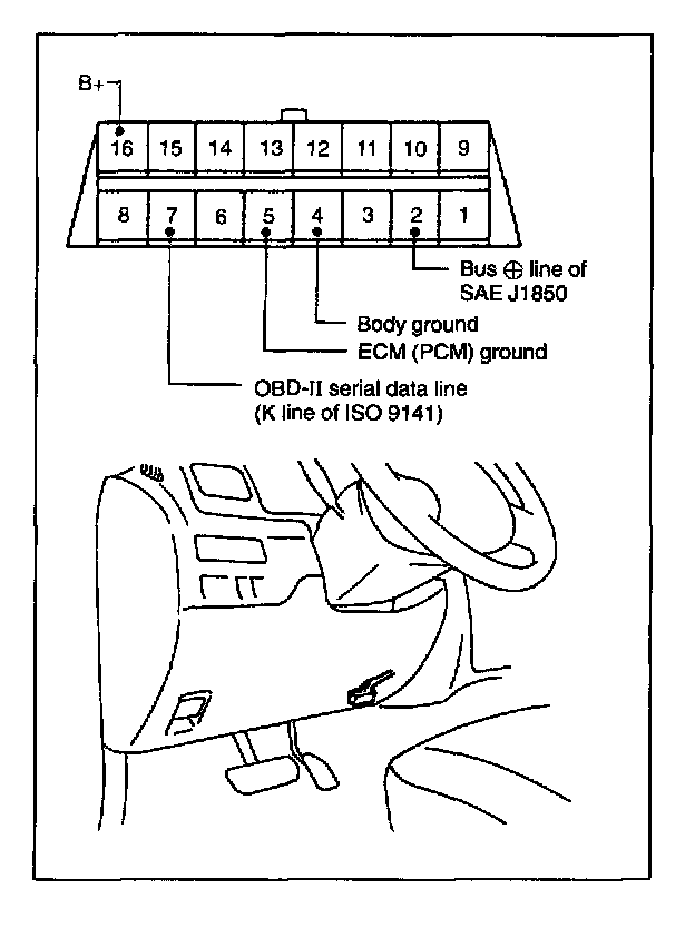 OBD-II serial data line (K line of ISO 9141) is used for SUZUKI scan tool or OBD-II generic scan tool to communication with ECM (PCM) and Airbag SDM. Bus (+) line of SAE J1850 is used for SUZUKI scan tool to communicate with ABS control module.
