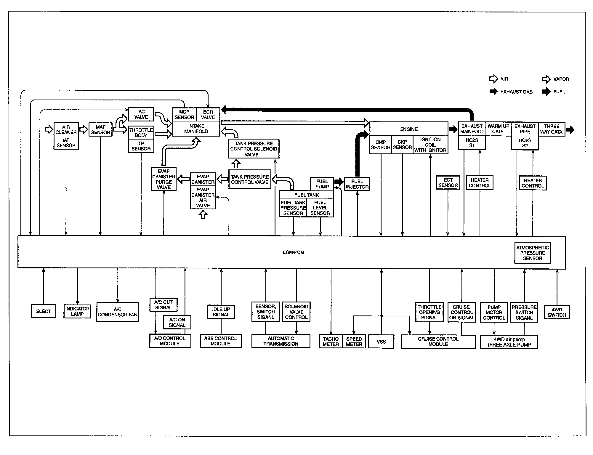 The electronic control system consists of 1) various sensors which detect the state of engine and driving conditions, 2) ECM (PCM) which controls various devices according to the signals from the sensors and 3) various controlled devices.