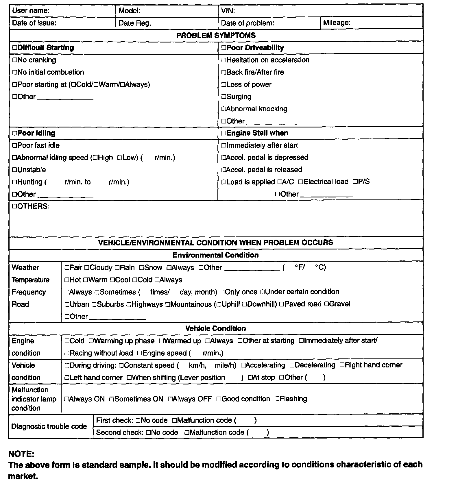 Record details of the problem (failure, complaint) and how it occurred as described by the customer. For this purpose, use of such an inspection form will facilitate collecting information to the point required for proper analysis and diagnosis.