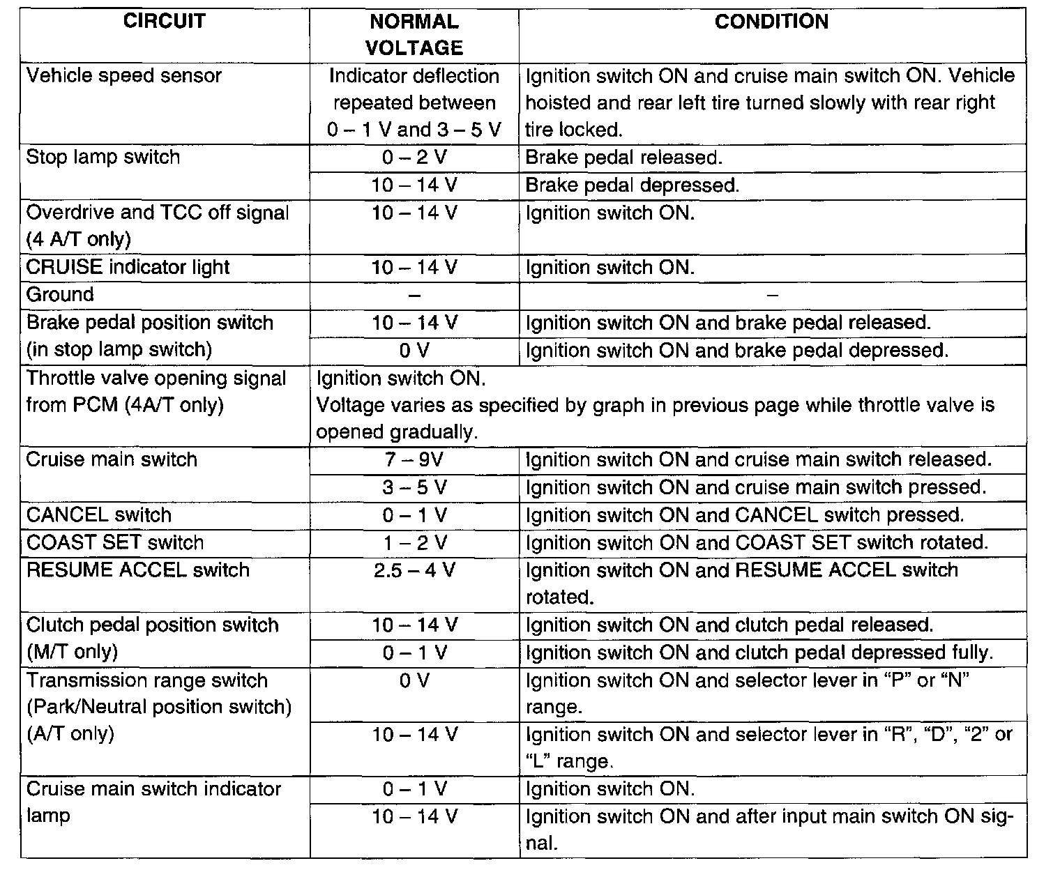CAUTION: Cruise control module can not be checked by itself. It is strictly prohibited to connect voltmeter or ohmmeter to cruise control module with coupler disconnected from it.VOLTAGE CHECK