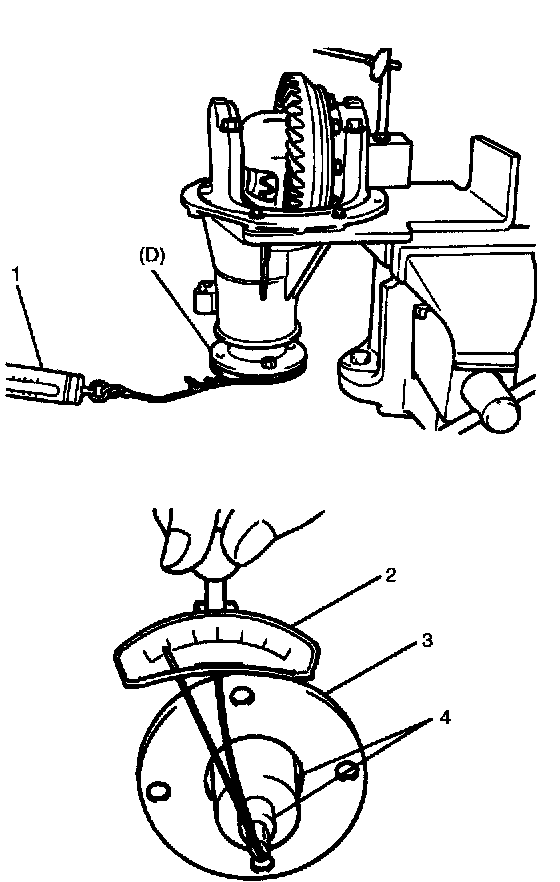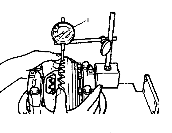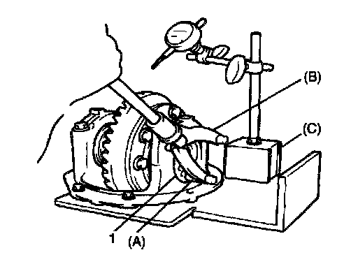 ^ Be sure to apply measuring tip of dial gauge (1) at right angles to convex side of tooth.