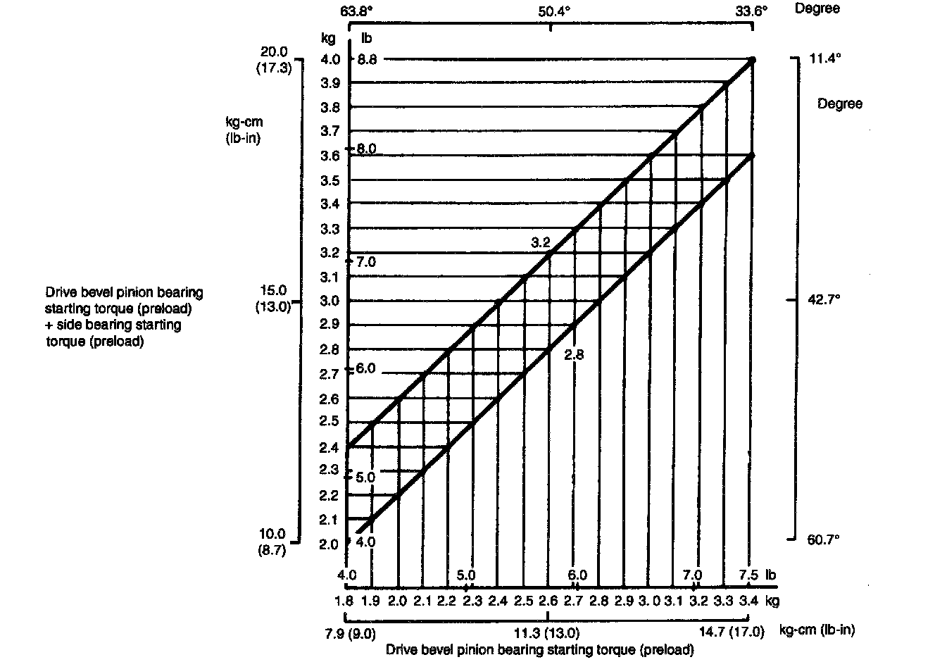 NOTE: Standard preload is shown in the graph, which should be read as follows. Example: When preload of bevel pinion is 2.6 kg/5.73 lb, acceptable composite preload of both pinion bearings and side bearings should be between 2.8 and 3.2 kg/6.17 and 7.05 lb.