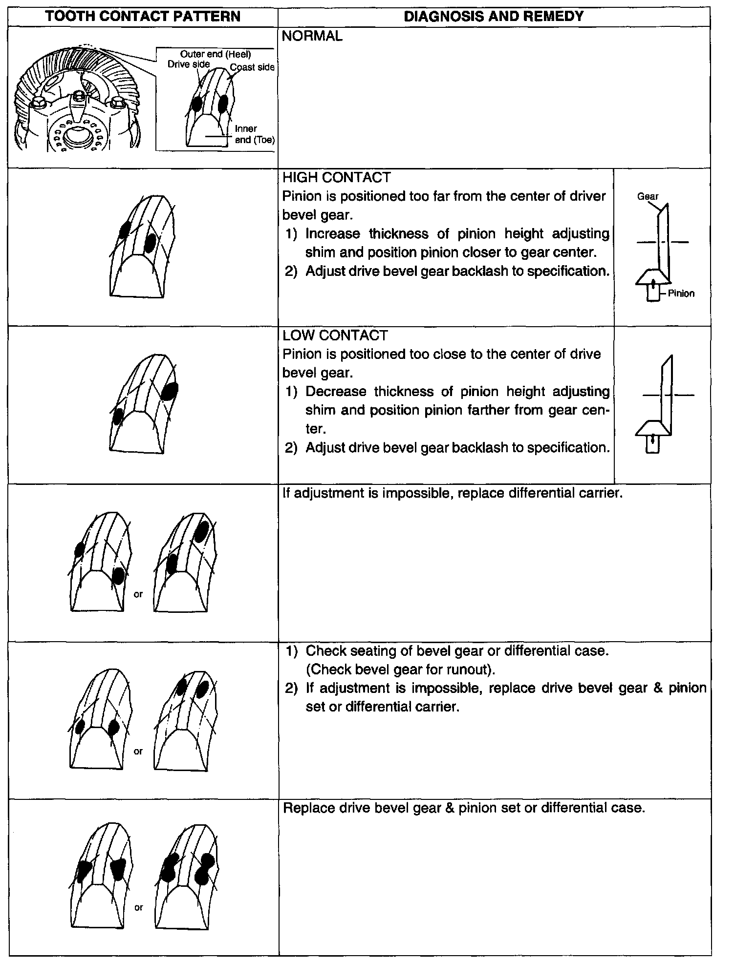 c. Bring painted part up and check contact pattern, referring to the following table. If contact pattern is not normal, readjust or replace as necessary according to instruction in chart.