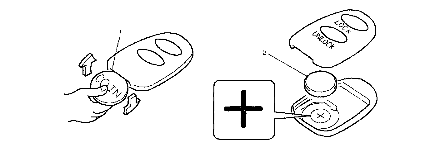 2. Replace the battery (lithium disc-type CR2032 or equivalent) (2) so its "+" terminal faces the "+" mark of the transmitter.