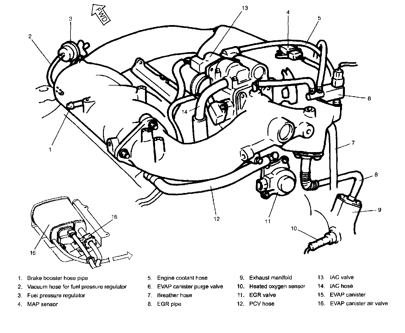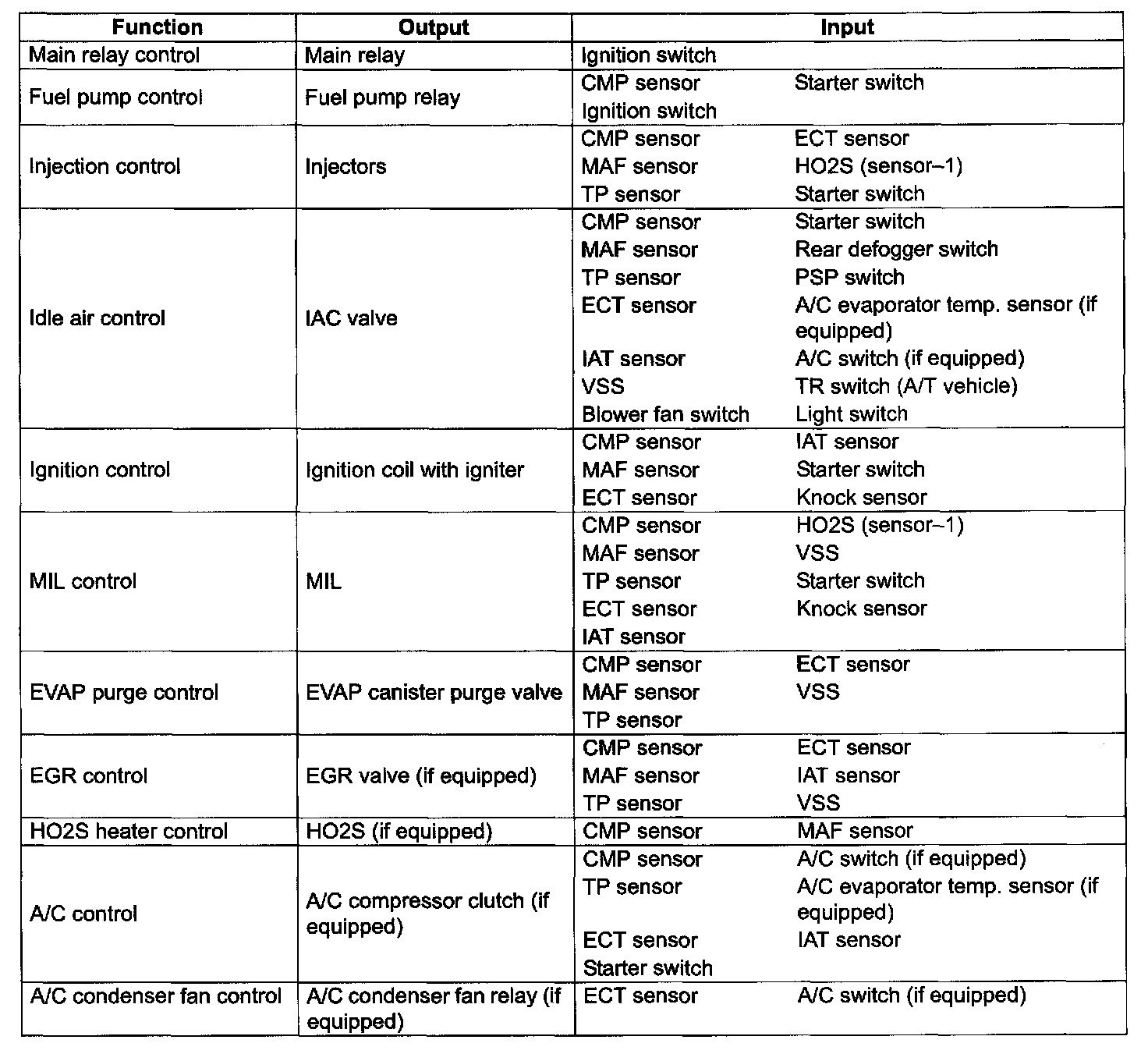 Air intake system includes air cleaner, mass air flow sensor, throttle body, idle air control valve and intake manifold. Fuel delivery system includes fuel pump, delivery pipe, fuel pressure regulator, fuel injectors, etc. Electronic control system includes ECM (PCM), various sensors and controlled devices.