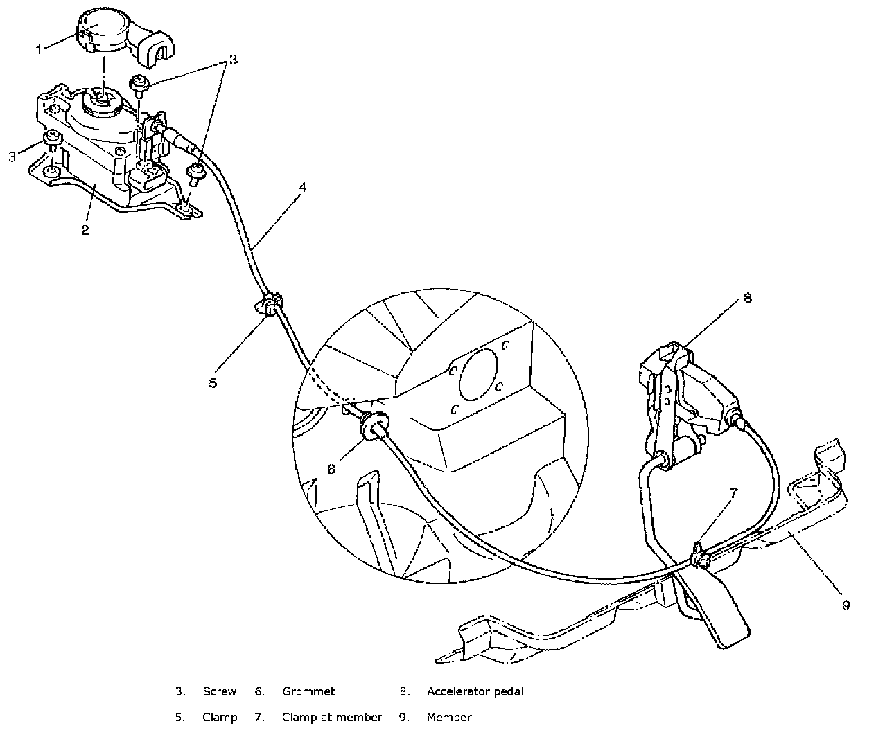 1. Disconnect cruise cable from cruise control arm and accelerator pedal bracket.