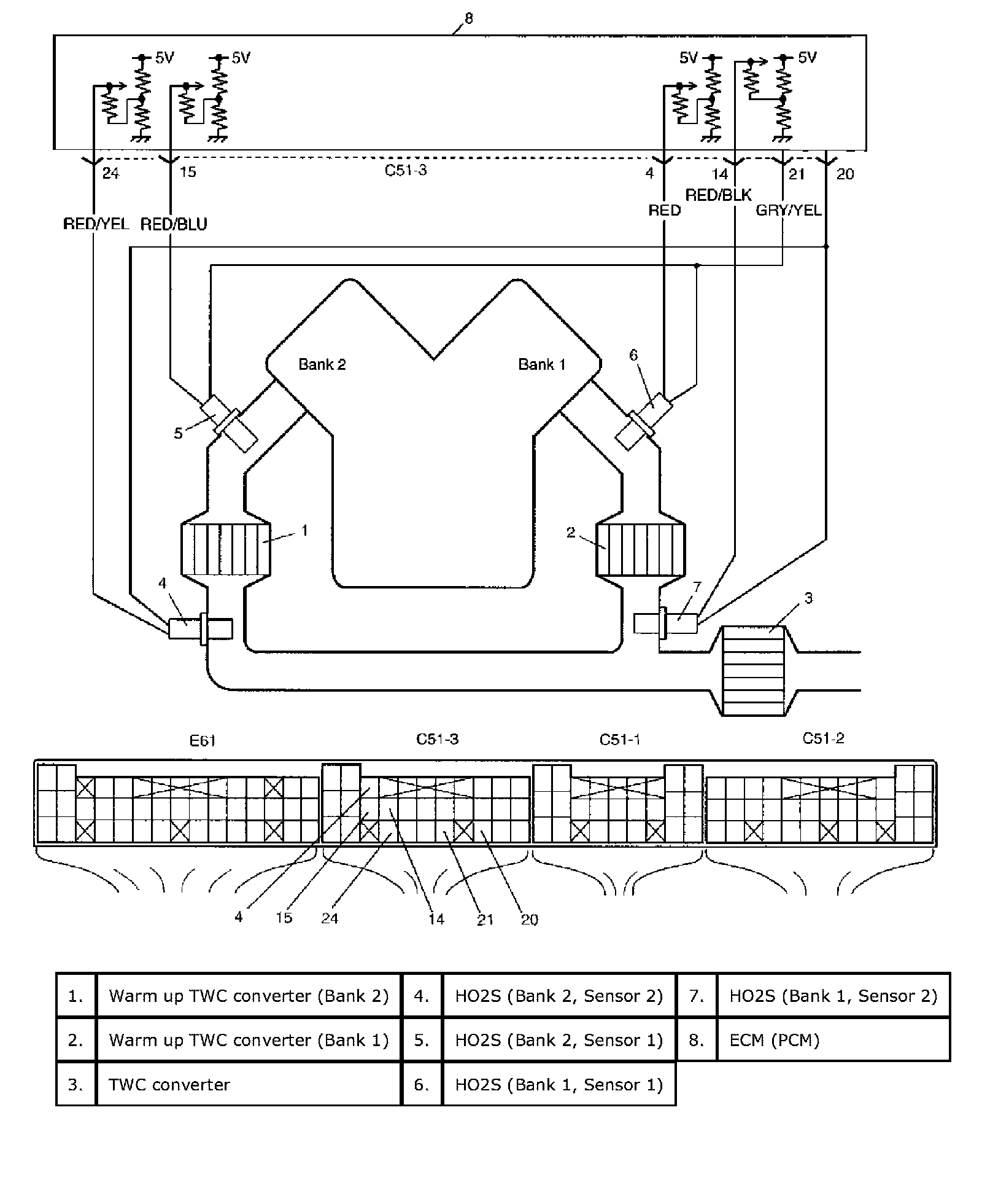 Exhaust oxygen concentration at the upper part and the lower part of WU-TWC is detected from HO2S-1 and HO2S-2 respectively and accordingly ECM (PCM) controls the closed loop which then controls the fuel injection volume. While the above control is going on and if WUTWC is in good condition, the output voltage of HO2S-2 is maintained at specified level. As WU-TWC becomes deteriorated, even when the above control is going on, the exhaust gas which has passed WU-TWC then passes HO2S-2 at the exhaust oxygen concentration similar to that of the upper part of WU-TWC without being oxygenated or converted. Thus, waveforms of HO2S-1 and HO2S-2 output voltage become alike. ECM (PCM) judges deterioration of WU-TWC by comparing waveforms of HO2S-1 and HO2S-2.