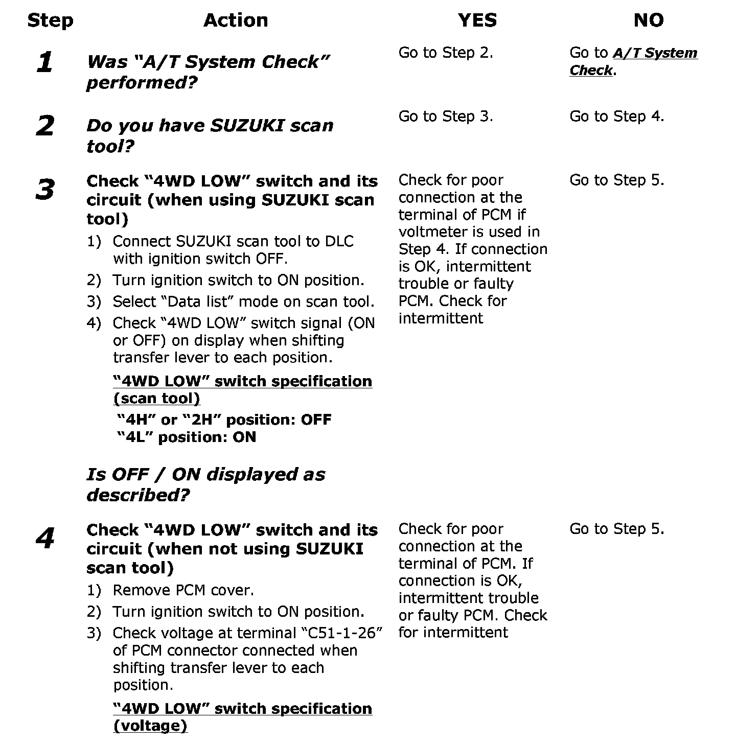 7) Increase vehicle speed to about 25 km/h (15 mph) or more in "D" range and is in "4L" position.