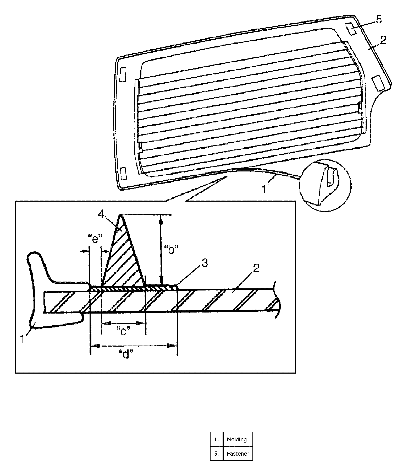 - Before applying primer to glass (2) edge, install molding (1) according to installing position shown in the figure.