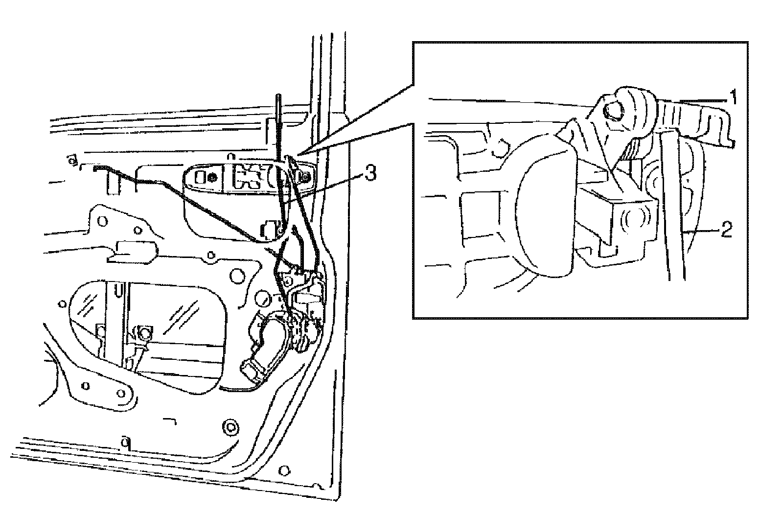 - Move door latch striker (1) sideways to adjust door (3) surface flush with body (2) surface, as shown.